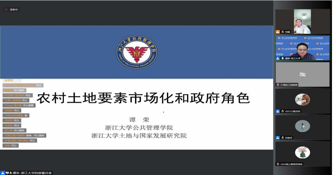 北风潜入悄无踪,未品秋浓冬已入。11月19日晚,浙江大学公共管理学院教授谭荣在腾讯会议上为av影片 众师生带来一场名为“农村土地要素市场化和政府角色”的主题讲座。社会发展与公共管理学院师生共二百余人在线学习。本次讲座由刘磊副教授主持,刘春芳教授担任讲座评议人。