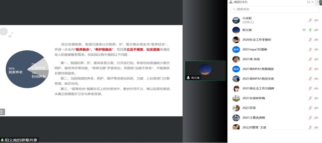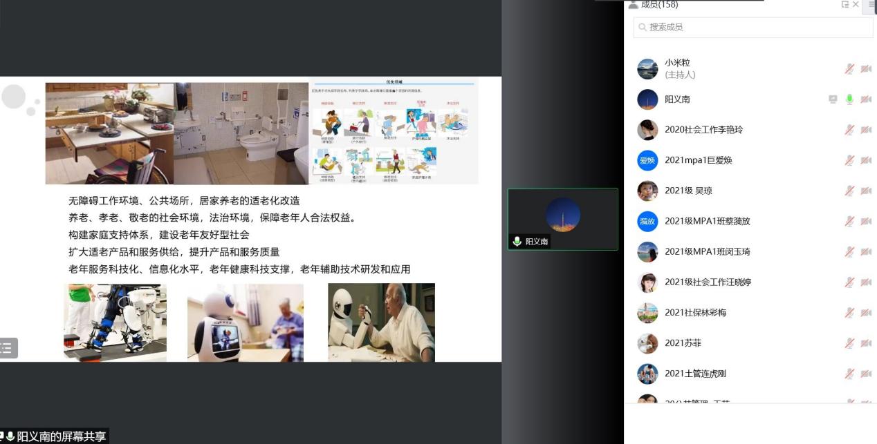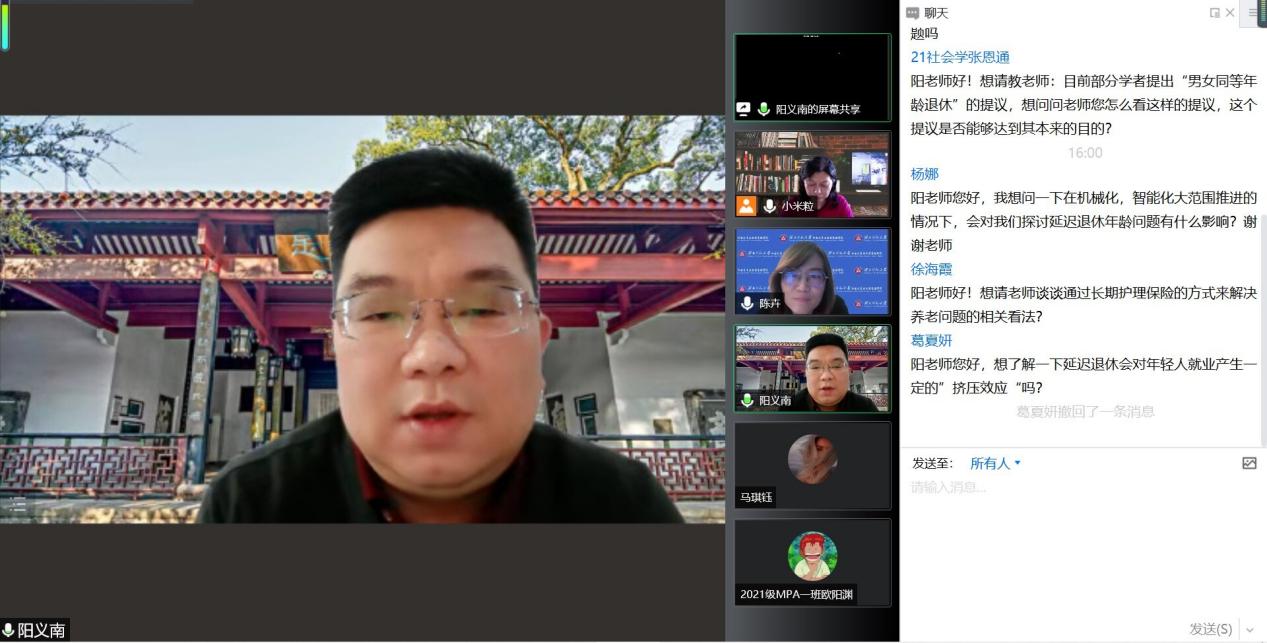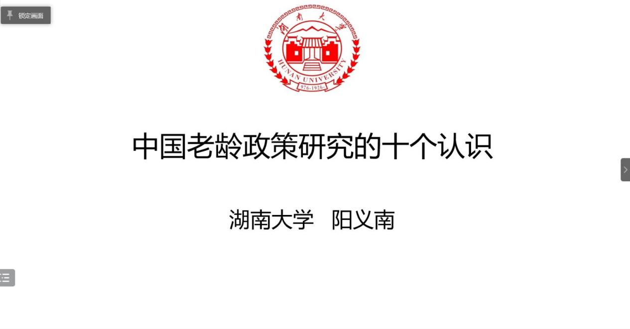 2021年11月18日下午,湖南大学博士生导师阳义南教授在腾讯会议上为av影片 众师生带来一场名为“中国老龄政策研究的十个认识”的主题讲座。社会发展与公共管理学院师生百余人在线学习。本次讲座由陈卉副教授主持,由戈银庆教授担任讲座评议人。