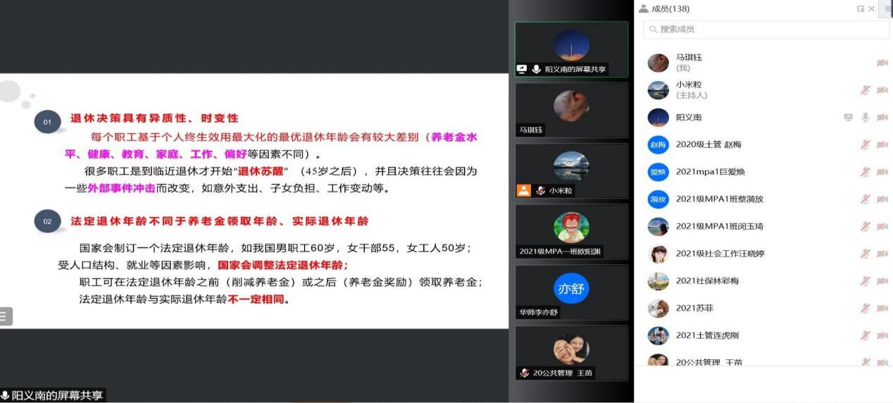 其次,阳教授从延迟退休改革和基本养老配套制度改革这两个内容中剖析了退休和养老这两个社会热点问题。阳教授从社会各界对此的反映中总结到,延迟退休需要尊重年长职工的健康条件和职工的就业意愿、就业能力和企业的用工需求。在养老制度方面,阳教授也指出其存在的问题和需要改进的方面:我国养老财富储备总量低,财源基础较为薄弱,还未建立制度化、成规模、稳定的养老财富常备机制,所以不仅要基于职工的实际退休年龄,实现精算平衡,避免提前退休者获得更多养老金,确保延迟退休者的养老金损失,而且要实行弹性延迟退休制度,允许职工根据个人特点和意愿自主选择退休年龄。