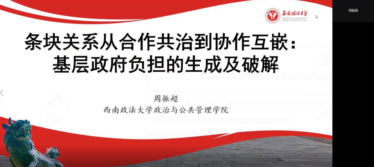 2021年11月24日晚,应av影片 邀请,西南政法大学政治与公共管理学院周振超教授在腾讯会议上为av影片 社会发展与公共管理学院师生带来了题为“条块关系,从合作共治到协作互嵌——基层政府负担的生成及破解”的学术讲座。本次讲座主持人为刘磊副教授,与谈人为张文礼教授,校内外近200名师生参加了本次线上讲座。