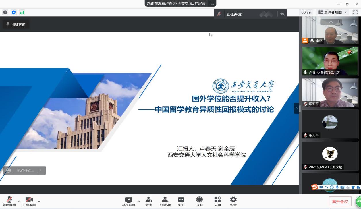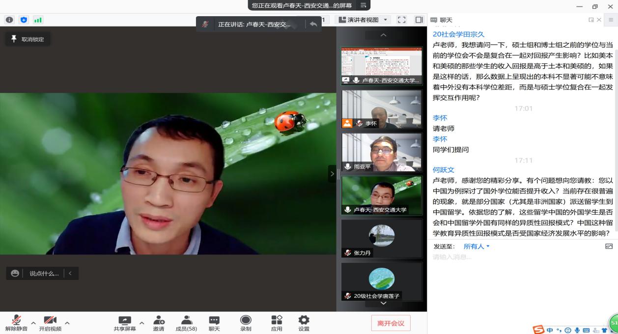 2021年12月2日下午,应av影片 邀请,西安交通大学社会学系教授卢春天在腾讯会议上为av影片 师生带来一场名为“国外学位能否提升收入?——中国留学教育异质性回报模式的探讨”的学术讲座。社会发展与公共管理学院部分研究生在线参加。本次讲座由李怀教授担任主持人,兰州大学周亚平教授担任与谈人。