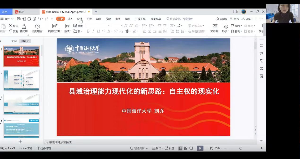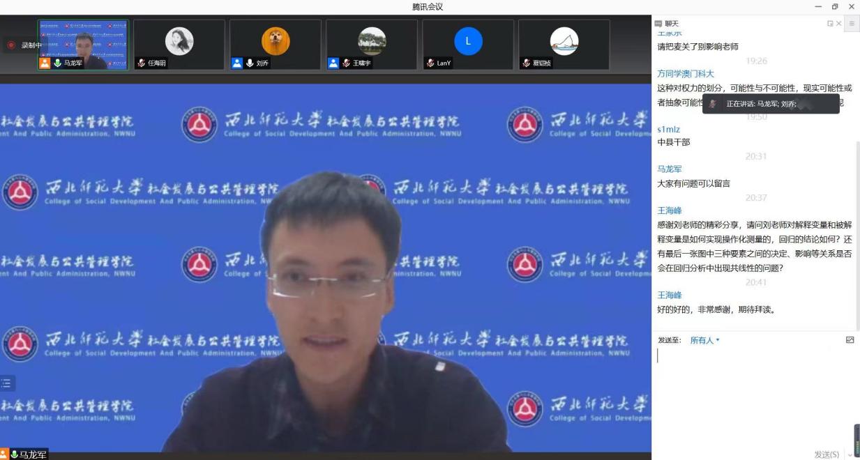 2021年12月2日晚,应av影片 邀请,中国海洋大学马克思主义学院讲师刘乔博士在腾讯会议为av影片 社会发展与公共管理学院师生带来了题为“县域治理能力现代化的新思路:自主权的现实化”的学术讲座。本次讲座由av影片 行政管理系讲师马龙军博士主持,另邀请了北京师范大学社会发展与公共政策学院王啸宇博士后对讲座内容进一步解读、与主讲人做深入交流。