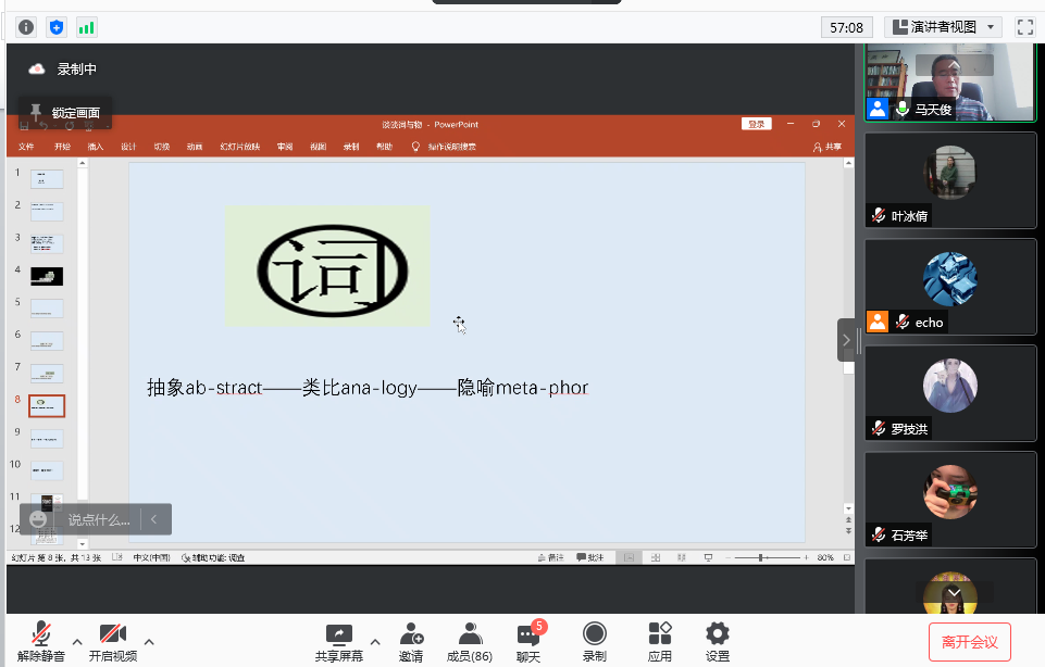 马天俊教授首先运用《论语》中的论述阐述了言与行的关系,用一张图表明了物、感官活动、言语与词之间的关系与差别。马教授讲到,物是世界的基本组成物,无论是否对它描述或命名,它都在那里,它只是某一具体的物。但当我们用天然官能活动去感受它,并且抽象出他的特征,用词去命名的时候,就完成了物与词之间的连接。言语的活动不是独立的,是需要在社会群体里形成的。我们要将言语活动与感官活动区分开。言语活动与感官活动的不同,既不能说是天然的,也不能说是个体的,言语它即是复杂生活的条件,也是复杂生活的结果。言语与社会相互依赖。感官作为天然官能,也有不确定性,言语活动也会比物的范围更加广阔。