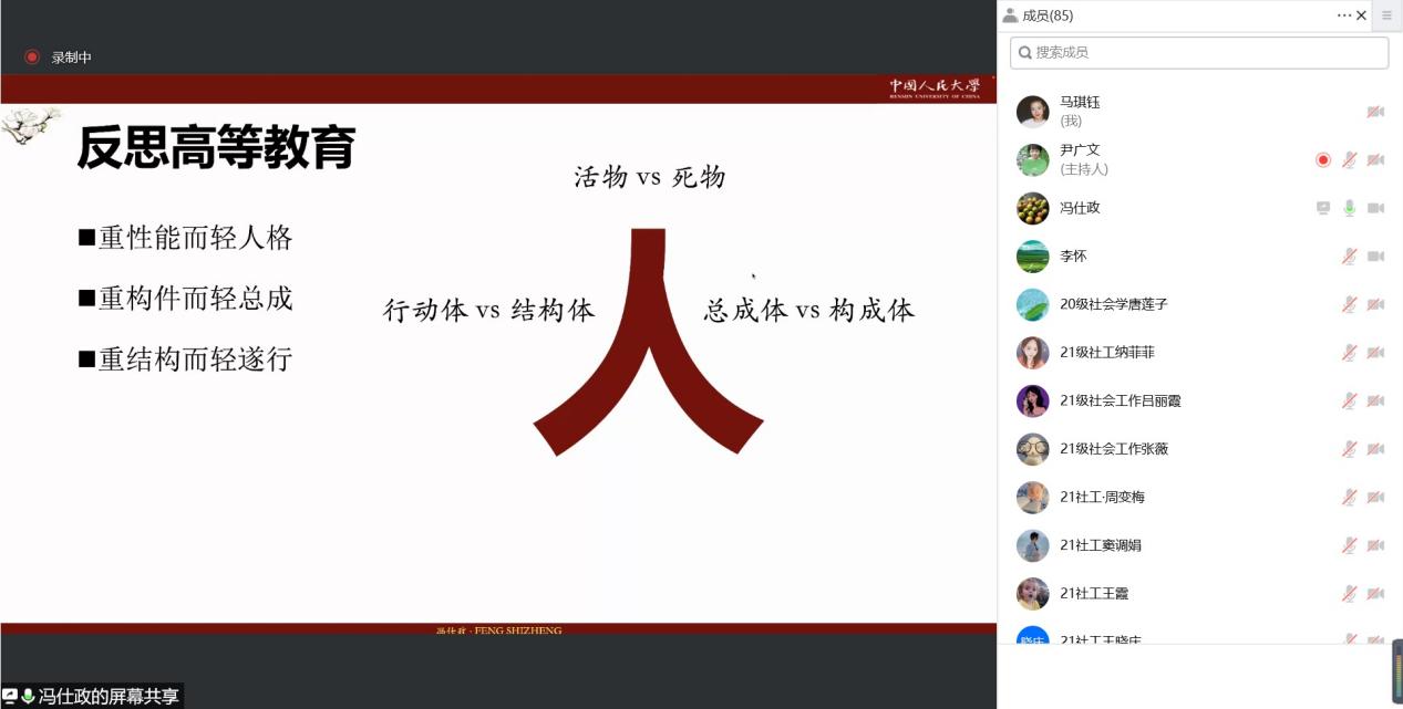 值百廿校庆之际,应av影片 邀请,中国人民大学社会与人口学院院长、长江学者特聘教授冯仕政老师于6月15日晚为av影片 社会发展与公共管理学院师生带来题为“气质养成与社会工作专业人才培养”的线上学术讲座。本场讲座由李怀教授主持。